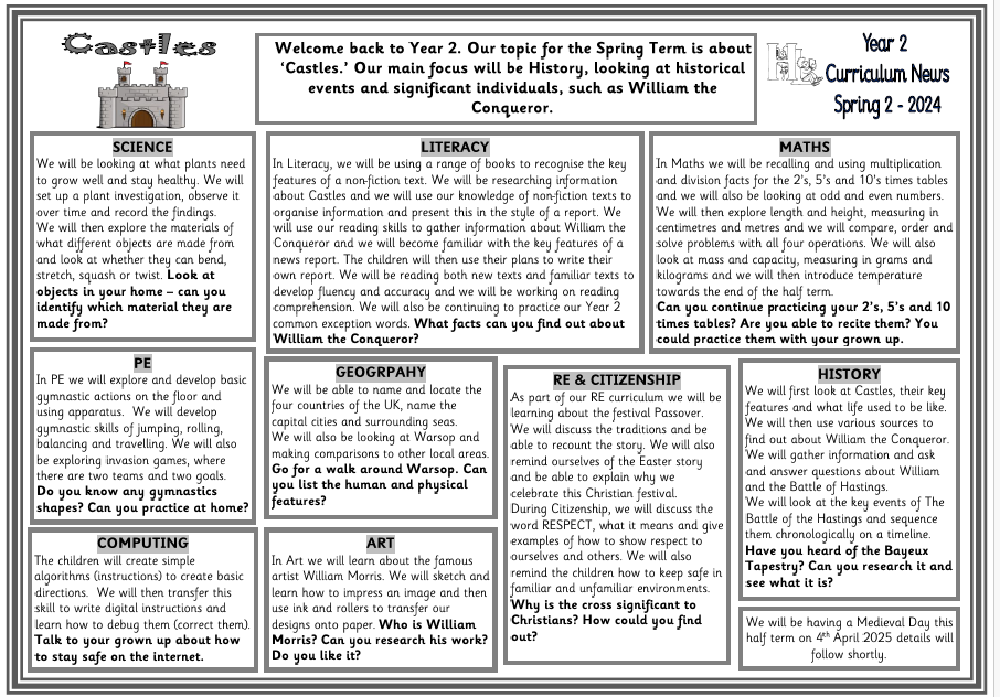 Our learning journey will continue under the heading of 'Heroes and Heroines' with a particular focus on Traditional Tales for the first half term. The second half term will have a focus on Historical events and significant individuals looking castles and William the Conqueror.