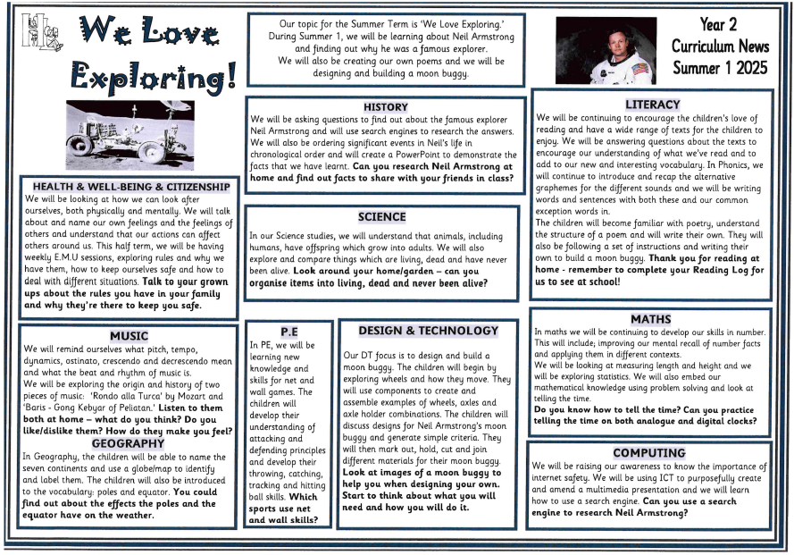 Our learning journey will continue under the heading of 'Exploring the Wider World' with a particular focus on History for the first half term. We will be using computing to research The First Moon Landing and Neil Armstrong and we will present our findings in a presentation in computing.